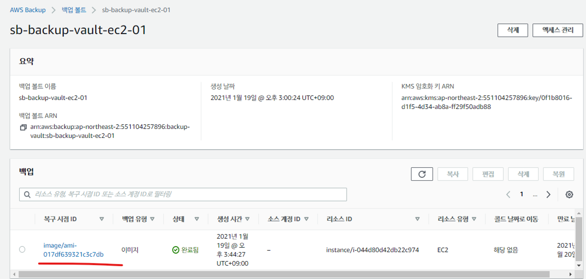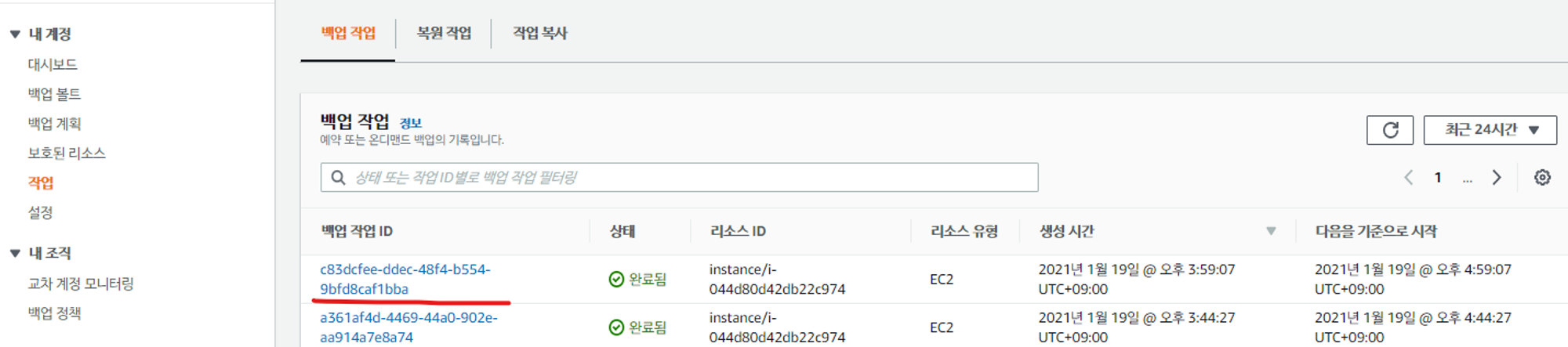 백업 볼트에서 생성된 백업 확인 가능 ( EC2 - 스냅샷에서도 확인 가능)