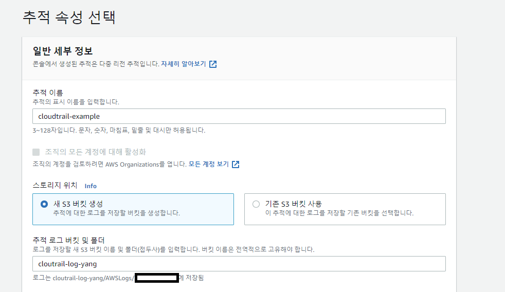 그리고 S3 버킷을 지정해 줘야한다. 추적에 대한 로그를 저장해야 하기 때문에 기존에 있는 버킷 혹은 새 S3 버킷을 생성해야 한다.