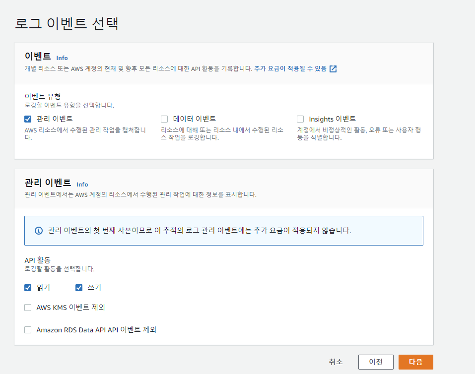 두 번째는 로그 이벤트를 선택하는 것이다. 위 세가지는 중복해서 선택할 수 있다. 나는 일단 관리 이벤트만 체크 한 후 다음으로 넘겨 주었다.