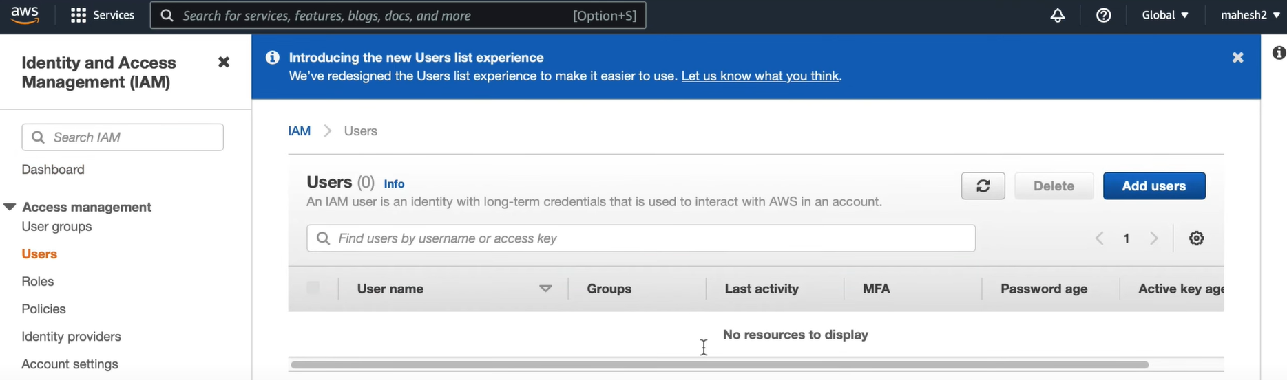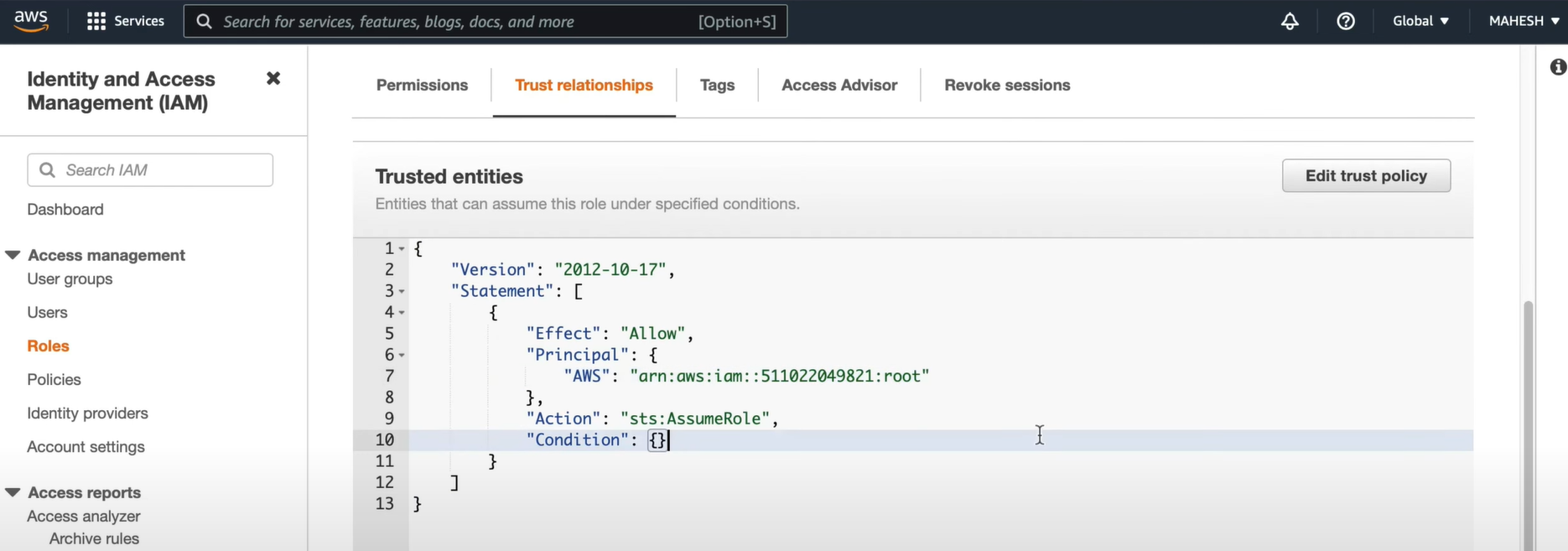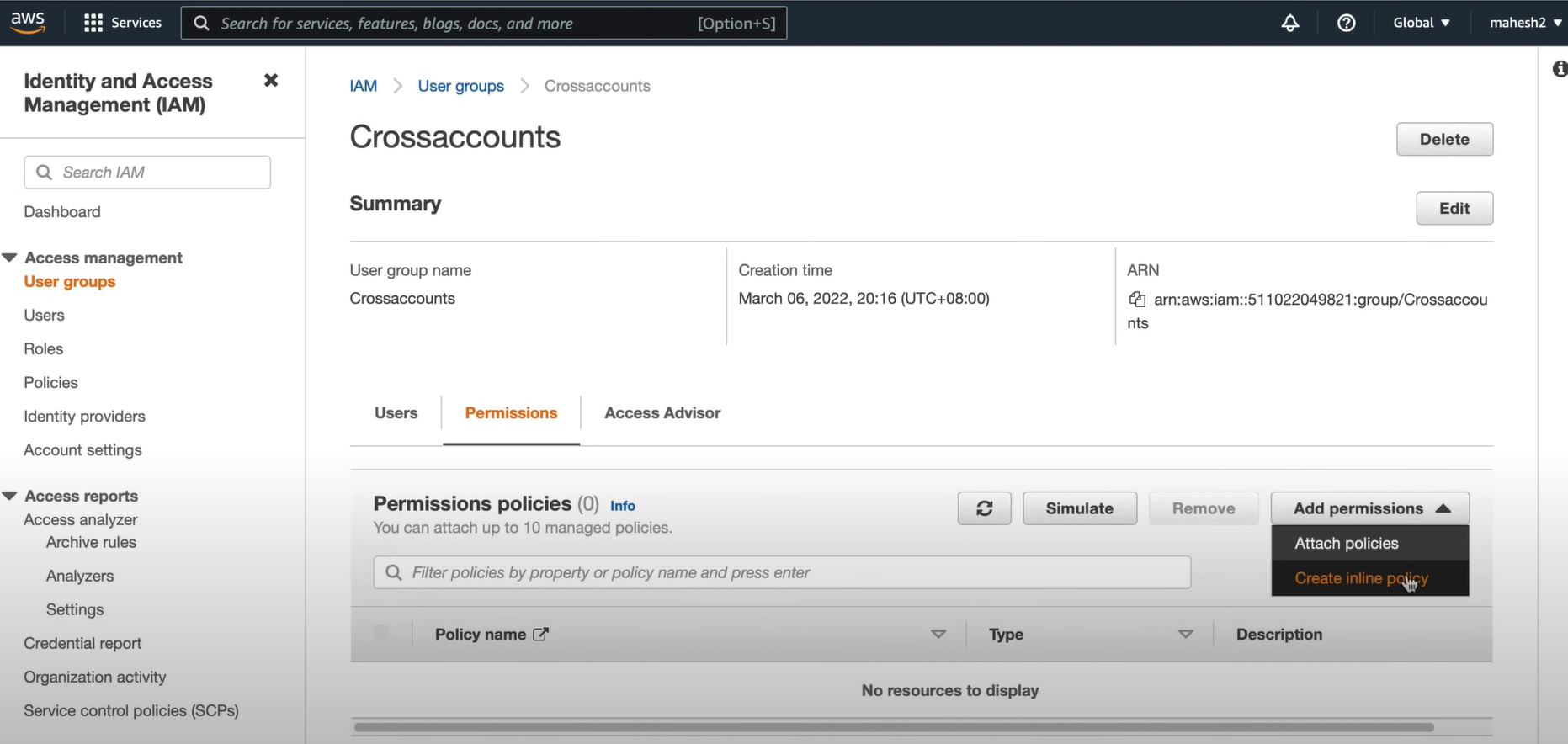2. MAHESH 계정에서 역할 생성