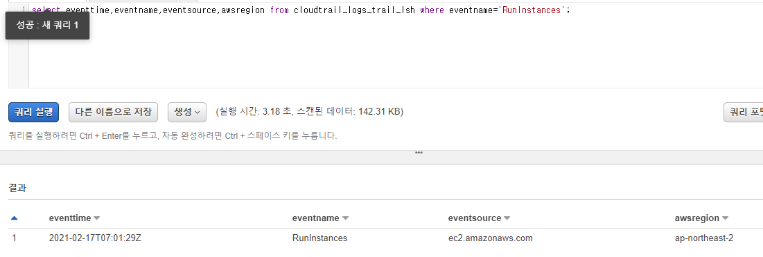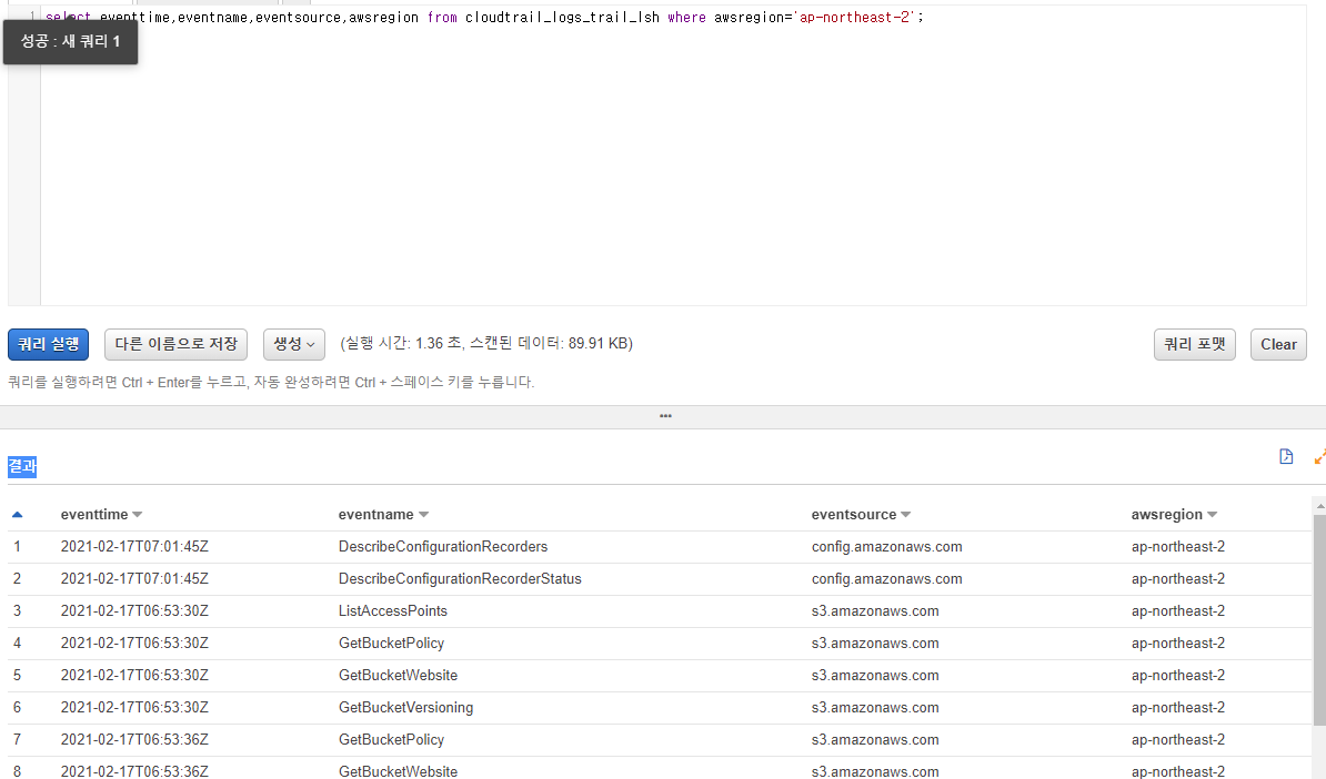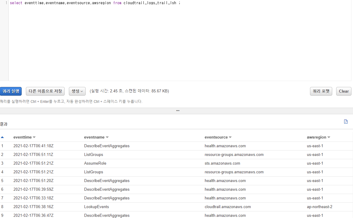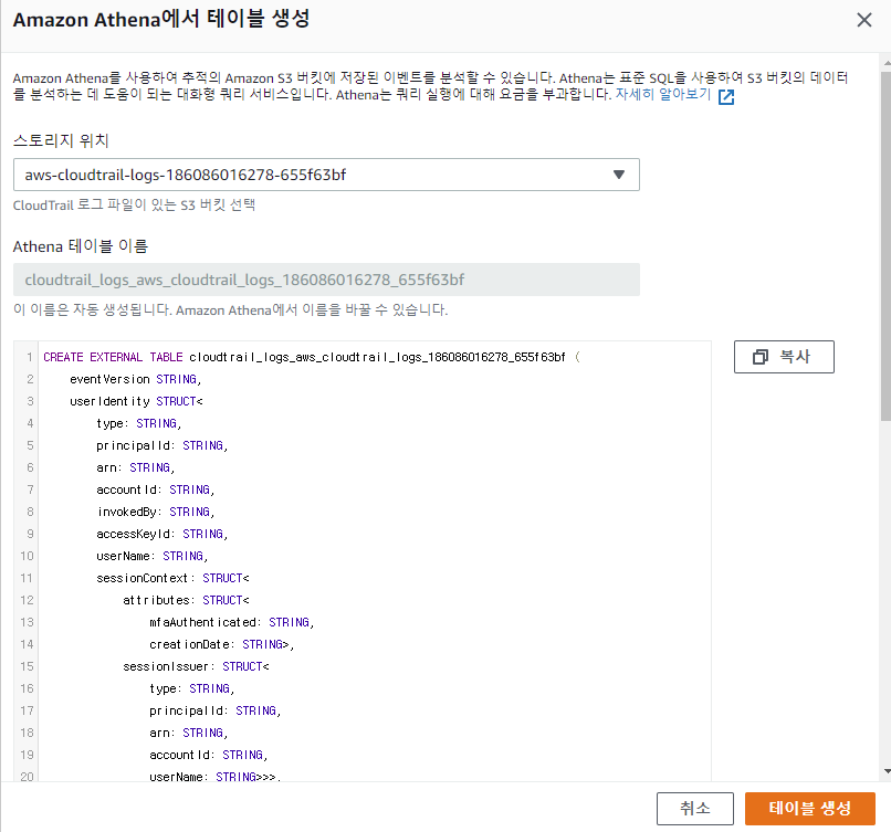 → 해당 테이블생성시 trail 에 대한 정보를 나타내 준다. → 또한 이전의 추적으로 생성한 버킷을 지정한다 (해당 버킷에 존재하는 로그를 대상으로 쿼리를 진행하기때문이다.)