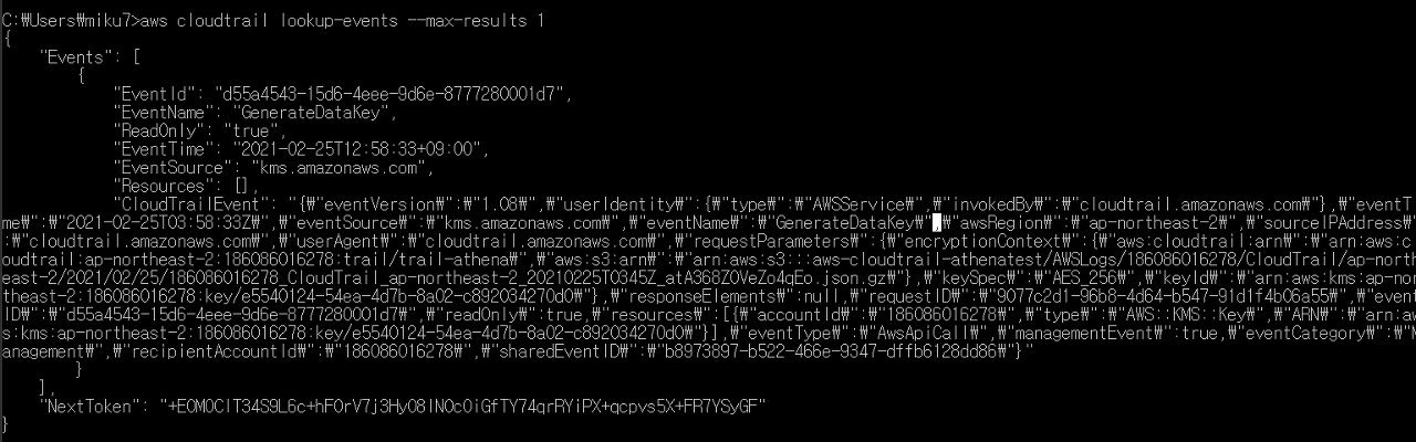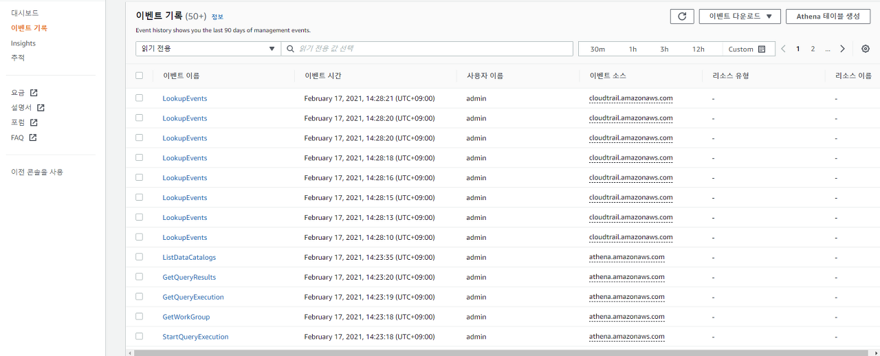 aws cloudtrail lookup-event help - > 이벤트에 대한 명령줄 도움받기 aws cloudtrail lookup-event --max-results 1 (default 10 1~50까지 가능) aws cloudtrail lookup-events --lookup-attributes AttributeKey=EventName,AttributeValue=RunInstances -> 인스턴스 구동된 이벤트 기록 (이벤트 이름으로 조회) aws cloudtrail lookup-events --lookup-attributes AttributeKey=EventSource,AttributeValue=ec2.amazonaws.com -> EventSource 조회 aws cloudtrail lookup-events --lookup-attributes AttributeKey=ResourceType,AttributeValue=AWS::S3::Bucket -> 리소스 유형