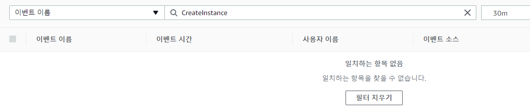→ 인스턴스 생성된것을 확인하고자 검색 결과 나타나지않음 → 다른 이벤트 이름으로 검색해보자!