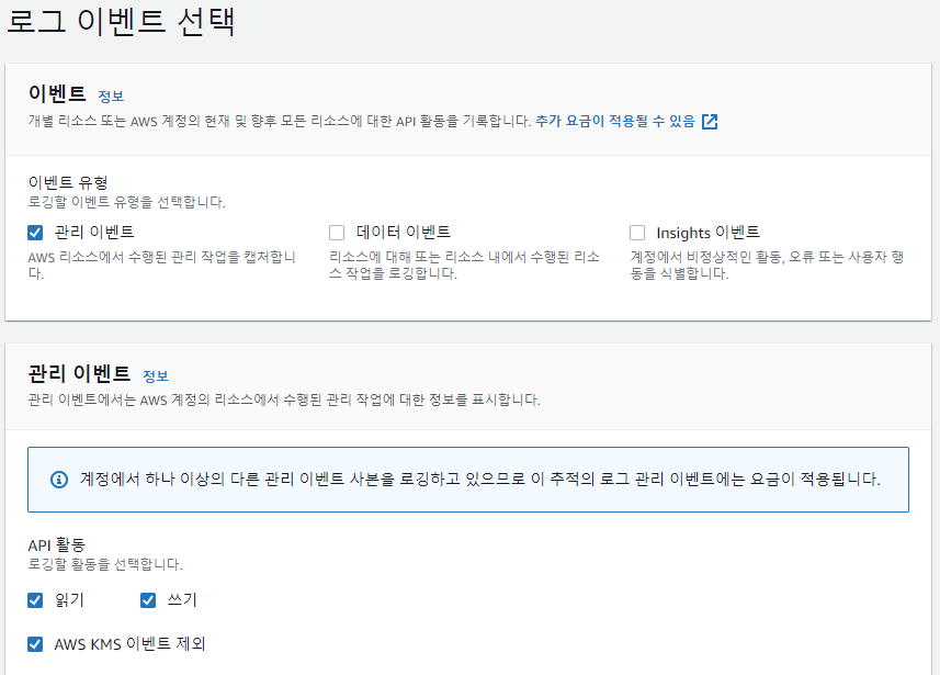 → kms 이벤트는 제외 모든 api활동 (이벤트는 관리 이벤트만 나머지는 추가비용)