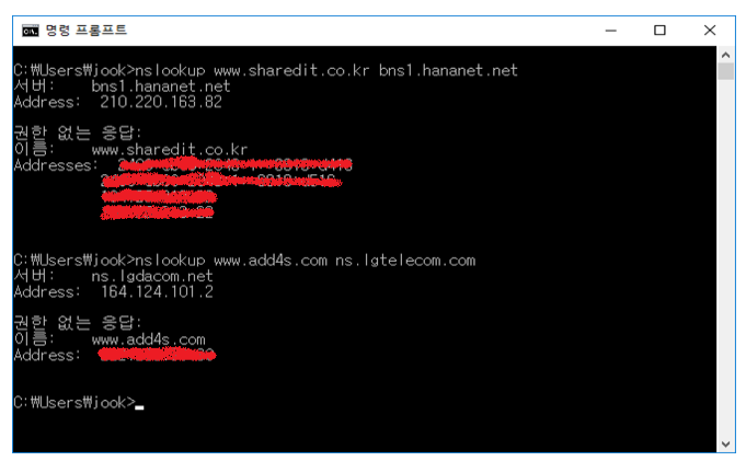 nslookup [도메인명] 을 입력하면 원하는 도메인의 ip정보가 출력된다.