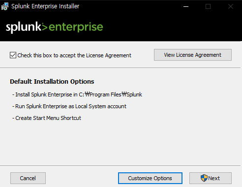 https://www.splunk.com/en_us/download/previous-releases.html 에서 msi 파일을 다운로드한 뒤, 해당 파일을 실행시켜주면 설치할 수 있다.