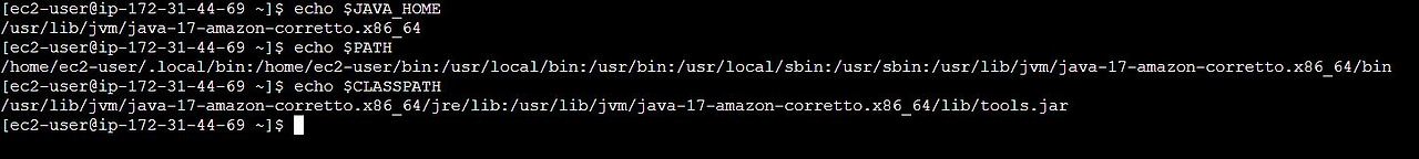 export JAVA_HOME=/usr/lib/jvm/java-17-amazon-corretto.x86_64 export PATH=$PATH:$JAVA_HOME/bin export CLASSPATH=$JAVA_HOME/jre/lib:$JAVA_HOME/lib/tools.jarJAVA_HOME은 위에서 찾은 java의 경로에 따라 달라질 수 있습니다.