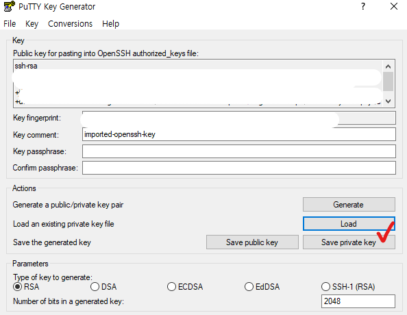 1. pem 파일을 불러온 뒤 "Save private key" 클릭!