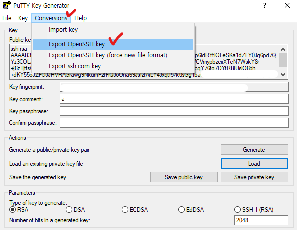파일을 불러오셨으면, Conversions -> Export OpenSSH key 클릭