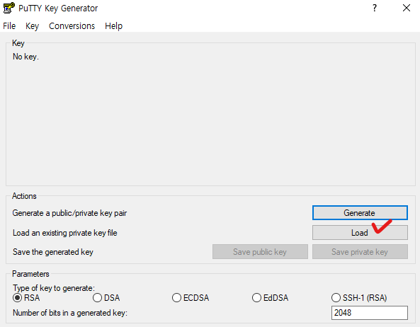 Load 버튼을 눌러 .ppk 파일을 가져옵니다.