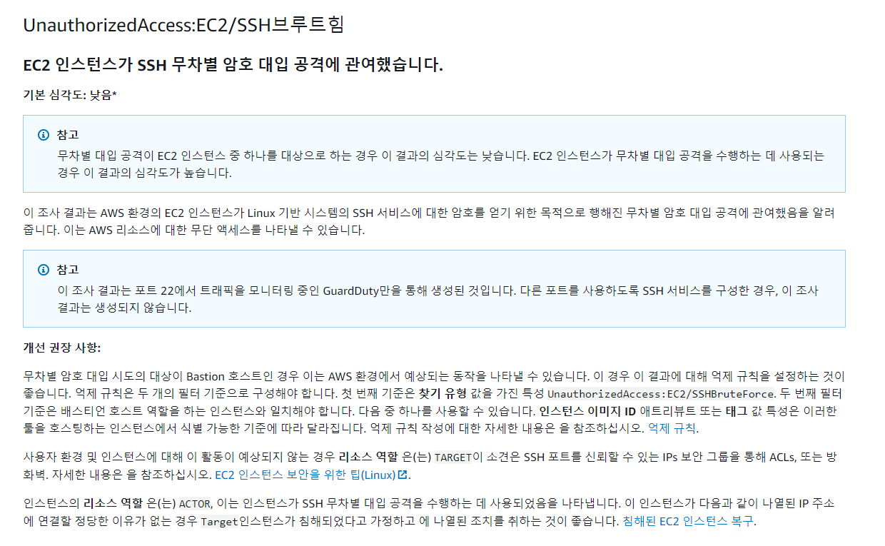최상단에 위치한 "Learn More" 링크를 누르면 해당 위협에 대한 정보와 권장 개선 사항에 대해 확인할 수 있는 AWS 문서로 연결됩니다.