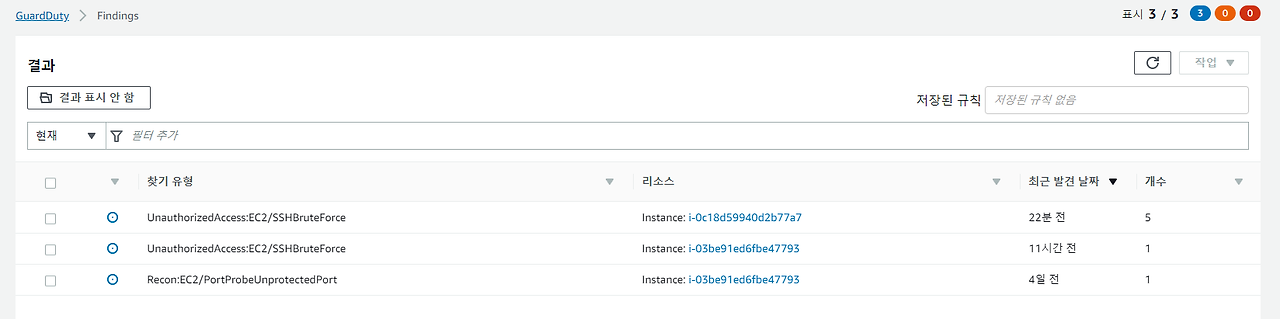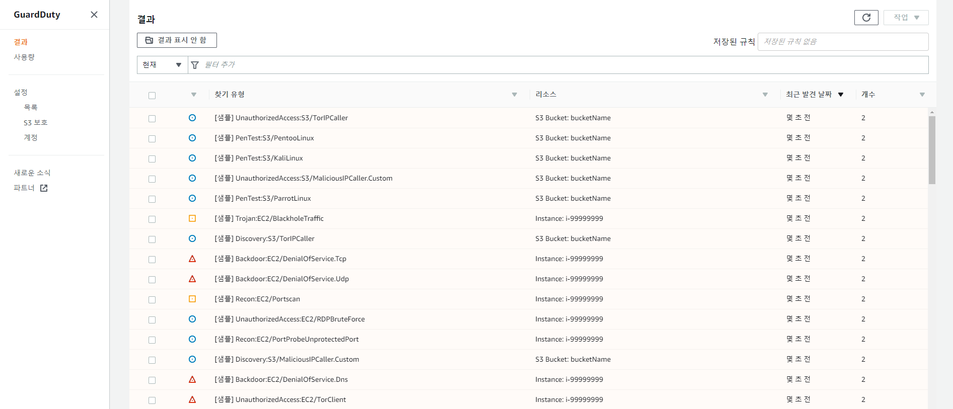 "결과" 메뉴로 들어가보면 현재 GuardDuty 에 의해 탐지된 위협을 확인할 수 있습니다.