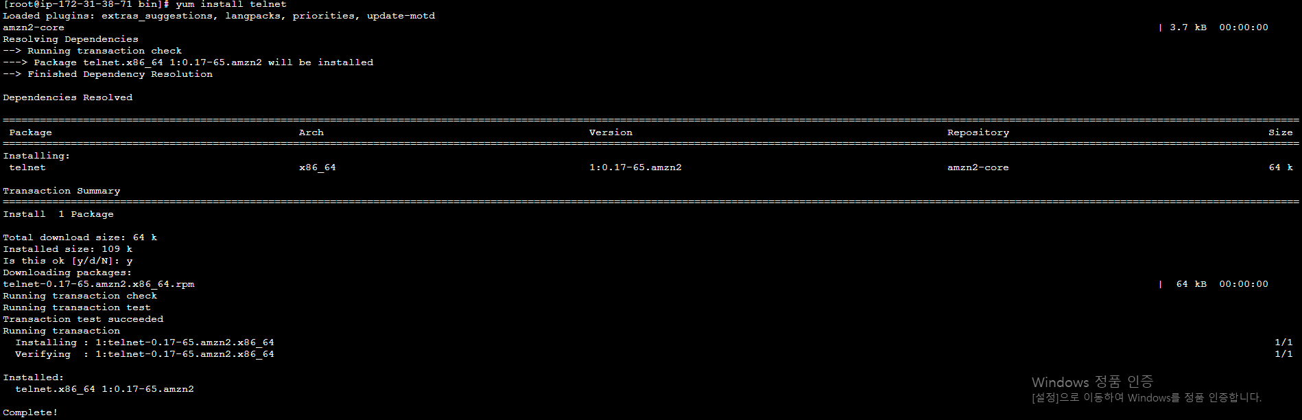yum install telnet 을 작성하고 엔터를 누르고 중간에 y를 눌러주면 telnet 다운로드가 된다.