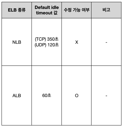 결론부터 정리하자면 connection idle timeout에 대해서는 아래 표와 같이 정리할 수 있다.