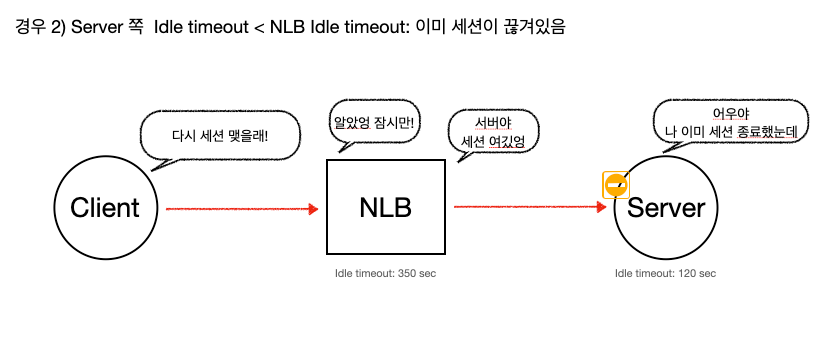 AWS에서 서버측 idle timeout을 LB에 설정된 idle timeout보다 크게 설정하기를 권고하는 이유에 대해서는 설명되어 있지 않지만… 그냥 예상해보건데 LB의 idle timeout보다 서버의 idle timeout이 작을 경우 이미 서버에서는 종료된 세션인데 ELB에서는 Idle time이 아직 지나지 않은 것 즉, 살아있는 세션으로 생각하여 서버로 요청을 보내게 되니깐 이를 방지하기 위해서이지 않을까한다.