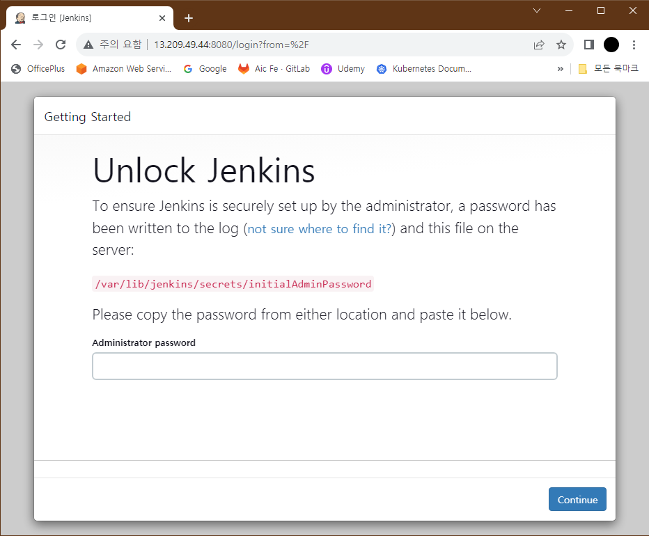 출력된 패스워드를 브라우저에 띄워진 jenkins 서비스에 Administator password 공란에 입력한다.