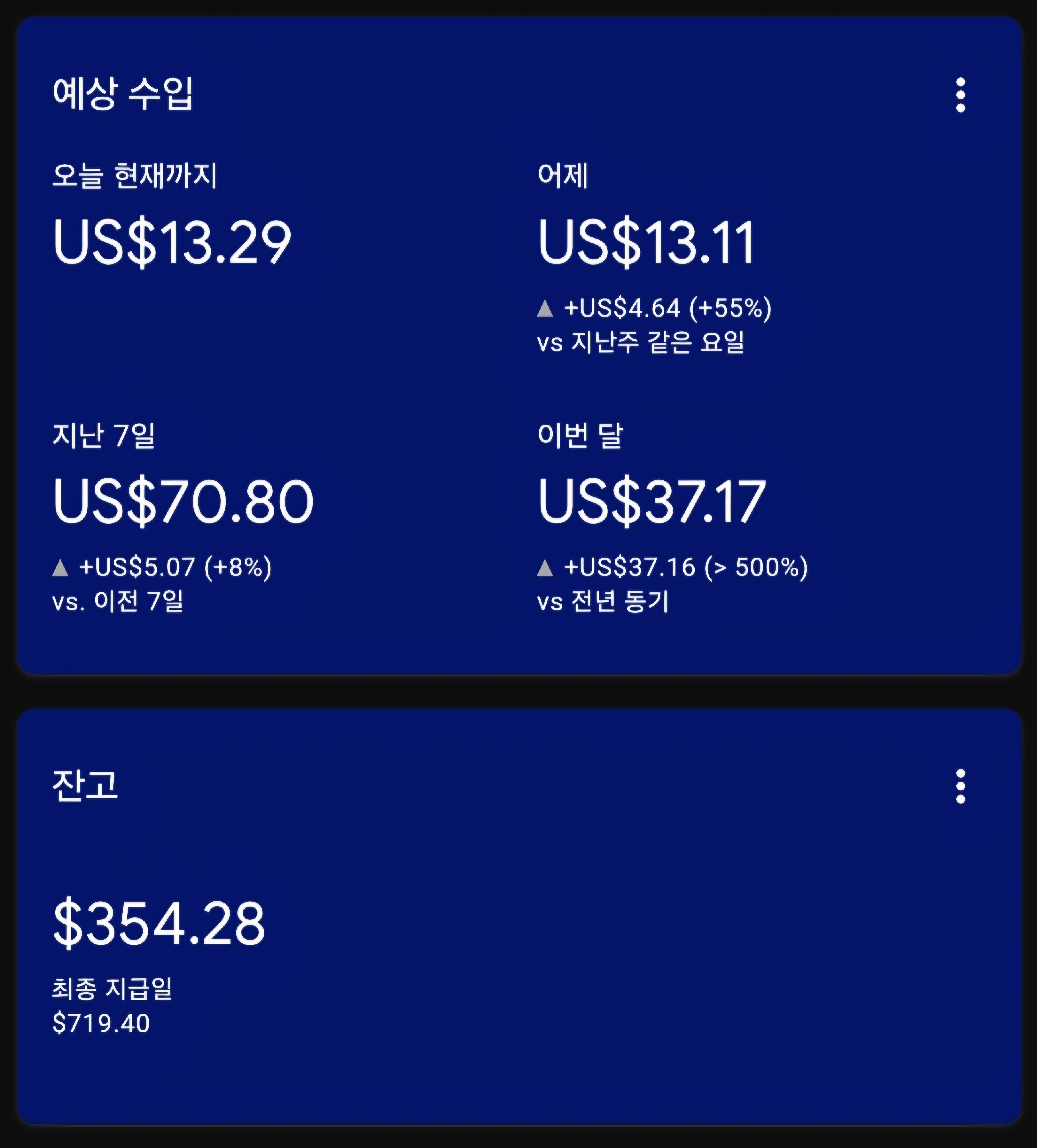 | [인터넷건물주 - 9월 월세] US $89 돌파 - AdSense & Dable 입성 9/8일!! (11) | 2024.09.08 |