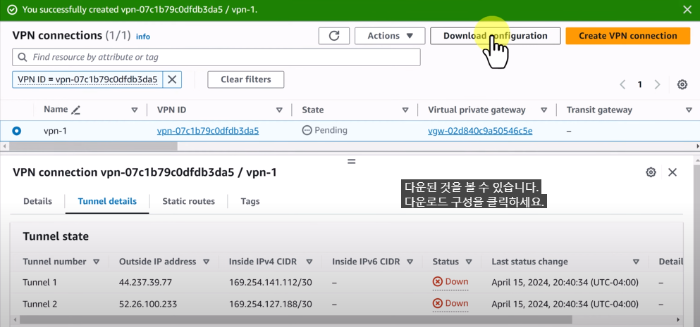 - AWS VPC 대역 등록 (172.31.0.0/16) ==> 터널2 설정