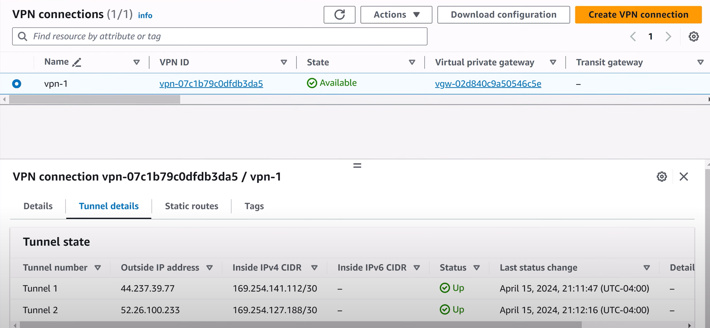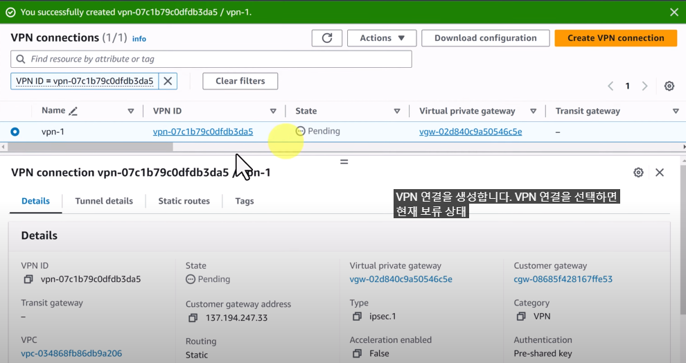 - AWS VPC 대역 등록 (172.31.0.0/16) ==> 터널1 설정