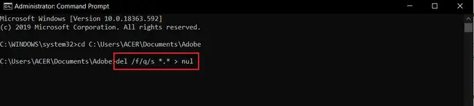 2. 다음을 입력합니다.command그리고 치다Enter key.메모:변경path위의 명령에서folder path삭제하려는 항목.Method 2:Delete Folders and Subfolders inCommand Prompt1. 누르다Windows + Q keys시작하기 위해search bar.2. 유형Command Prompt그리고Run as Administrator오른쪽 창에서3. 클릭Yes에서User Account Control메시지가 표시되면 팝업이 표시됩니다.예를 들어,cd C:UsersACERDocumentsAdobe아래 그림과 같이. 7. 다음을 입력합니다.command그리고 치다Enter지정한 폴더를 삭제합니다.변경FOLDER_NAME삭제하려는 폴더의 이름.명령 프롬프트에서 대용량 폴더 및 하위 폴더를 삭제하는 방법입니다.Windows PowerShell 또는 명령 프롬프트에서 폴더 및 하위 폴더를 삭제하는 방법을 배웠지만 모든 개별 대용량 폴더에 대해 절차를 반복해야 합니다. 이를 더욱 쉽게 하기 위해 사용자는 명령의 배치 파일을 만든 다음 해당 명령을 파일 탐색기에 추가할 수 있습니다.context menu. 파일/폴더를 마우스 오른쪽 버튼으로 클릭하면 나타나는 메뉴입니다. 그러면 탐색기 내의 모든 파일과 폴더에 대해 빠른 삭제 옵션을 선택할 수 있습니다. 이것은 긴 절차이므로 주의 깊게 따르십시오. 4. 유형quick_delete.bat~처럼File name:그리고Save.5. 이동Folder location. 마우스 오른쪽 버튼으로 클릭quick_delete.bat파일을 선택하고Copy강조 표시됩니다.6. 이동C:Windows~에File Explorer.누르다Ctrl + V keys붙여넣기quick_delete.bat여기 파일. 8. 유형regedit그리고 치다Enter열다Registry Editor. 10. 오른쪽 클릭shell. 딸깍 하는 소리New>Key컨텍스트 메뉴에서. 이 새 키의 이름을 다음과 같이 변경합니다.Quick Delete.11. 오른쪽 클릭Quick Delete, 이동New,그리고 선택Key아래 그림과 같이 메뉴에서12. 이름 바꾸기new key~처럼Command.13. 오른쪽 창에서(Default)열다Edit String.14. 유형cmd /c “cd %1 && quick_delete.bat”아래에Value Data:클릭OK빠른 삭제 옵션이 이제 Explorer 컨텍스트 메뉴에 추가되었습니다.16. 오른쪽 클릭folder그리고 선택Quick Delete그림과 같이 상황에 맞는 메뉴에서빠른 삭제를 선택하는 즉시 작업 확인을 요청하는 명령 프롬프트 창이 나타납니다.Note:그러나 실수로 잘못된 폴더를 선택하여 프로세스를 종료하려면Ctrl + C. 명령 프롬프트는 메시지를 표시하여 다시 확인을 요청합니다.Terminate batch job (Y/N)?누르다Y그리고 때리다Enter아래 그림과 같이 빠른 삭제 작업을 취소합니다.Pro Tip:Table of Parameters& their Uses 실행하다del /?더 많은 것을 배우기 위해.위의 방법들이 가장 효과적인 방법은delete large folders in Windows 10. 이 가이드가 학습에 도움이 되었기를 바랍니다.how to delete folders and subfolders in PowerShell & Command Prompt. 또한 이 기사와 관련하여 질문/의견이 있는 경우 의견 섹션에 자유롭게 남겨주세요.