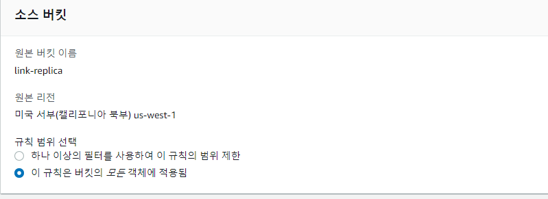- 원본 버킷 선택> 관리> 복제 규칙> 복제 규칙 생성