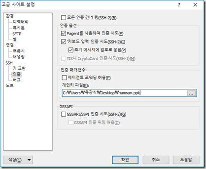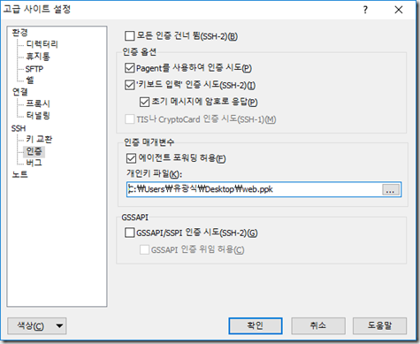 개인키 파일 항목에 Web 서버 접속에 필요한 Web.ppk 파일을 등록 후 확인을 선택합니다.
