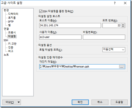 SSH 접속을 위해 생성했던 PPK 파일을 선택한 후 확인을 선택 합니다.