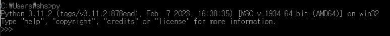 명령 프롬프트 창을 열고, py라고 명령어를 입력했을 때 아래처럼 나오면 설치가 완료된 겁니다.