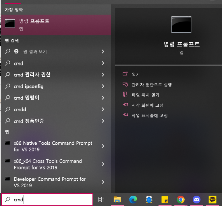 시작 메뉴에서 cmd 를 검색하면 명령 프롬프트 창을 열 수 있습니다.