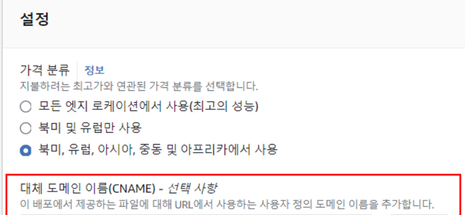 CloudFront와 Route53을 연결하기 위해서는 CloudFront의 대체 도매인이 필수로 필요합니다!(Route53이랑 같게 해주세요)