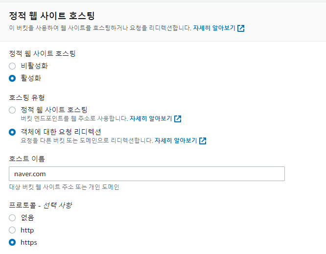 4. 생성한 S3에서 정적 웹 사이트 호스팅 편집에 들어가 리다이렉트 시키려고 하는 URL를 입력합니다.