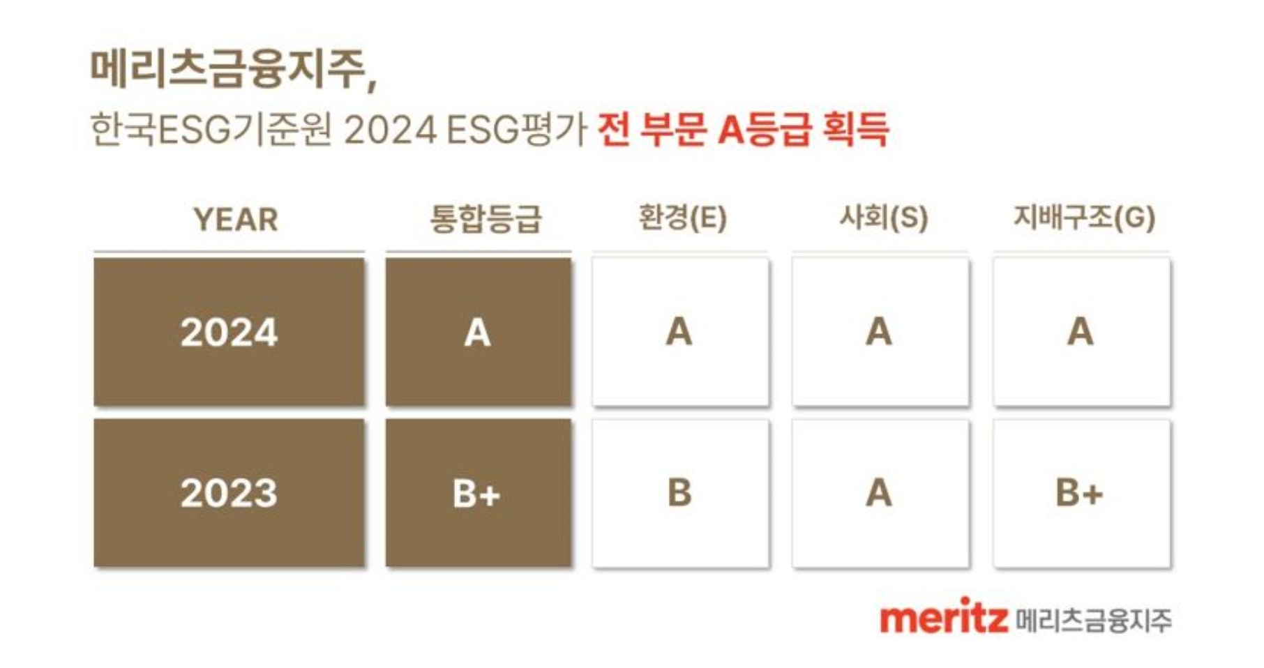 메리츠금융지주의 ESG 등급은 지난해 대비 환경부문에서 2단계(B→A), 지배구조에서 1단계(B+→A) 상승하며 통합등급이 1단계(B+→A) 올라갔다.