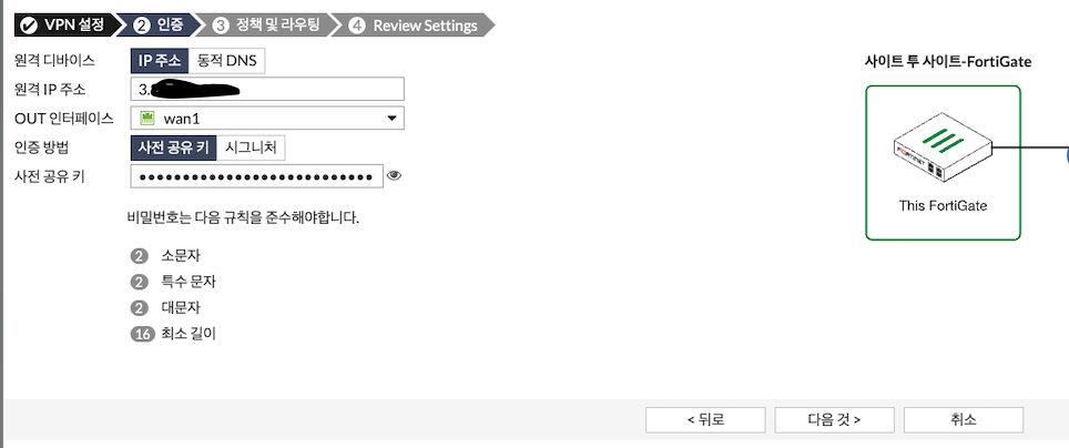 * 차후 fortigate VPN연동시 터널 외부IP와 Pre-shared Key필요