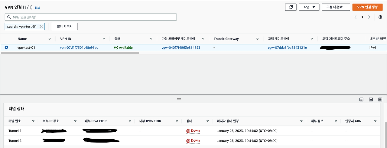 - AWS VPN에 터널상태도 Down에서 Up으로 변경되었다면 모든 STS VPN 설정 완료
