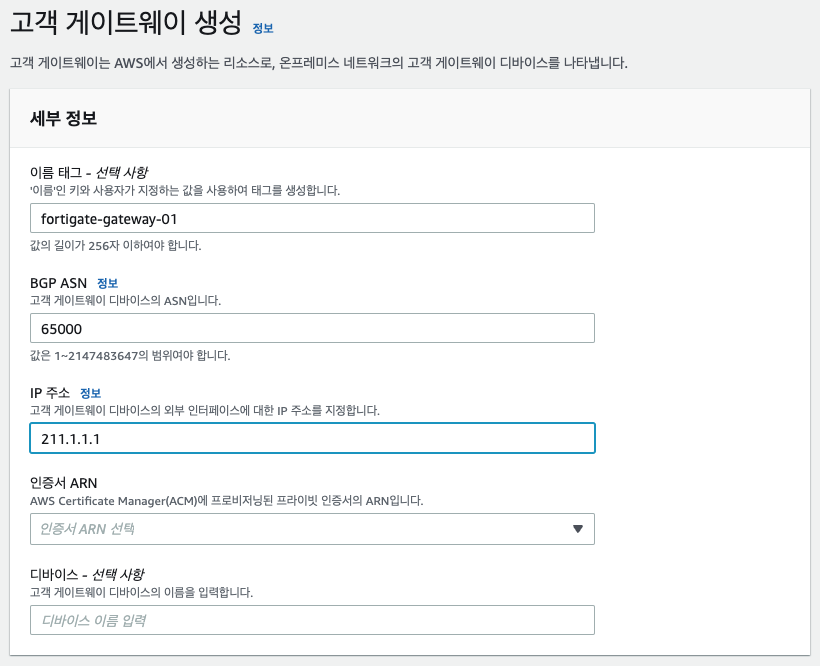 - AWS에서 VPC -> 가상 사설 네트워크(VPN) -> 고객 게이트 웨이 -> 고객 게이트웨이 생성 클릭