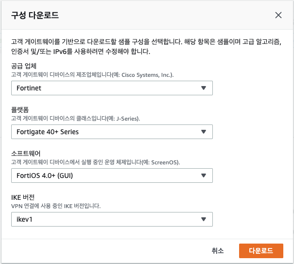 - 생성한 VPN을 선택하여 구성 다운로드 -> 공급업체 fortinet선택 -> 다운로드 클릭