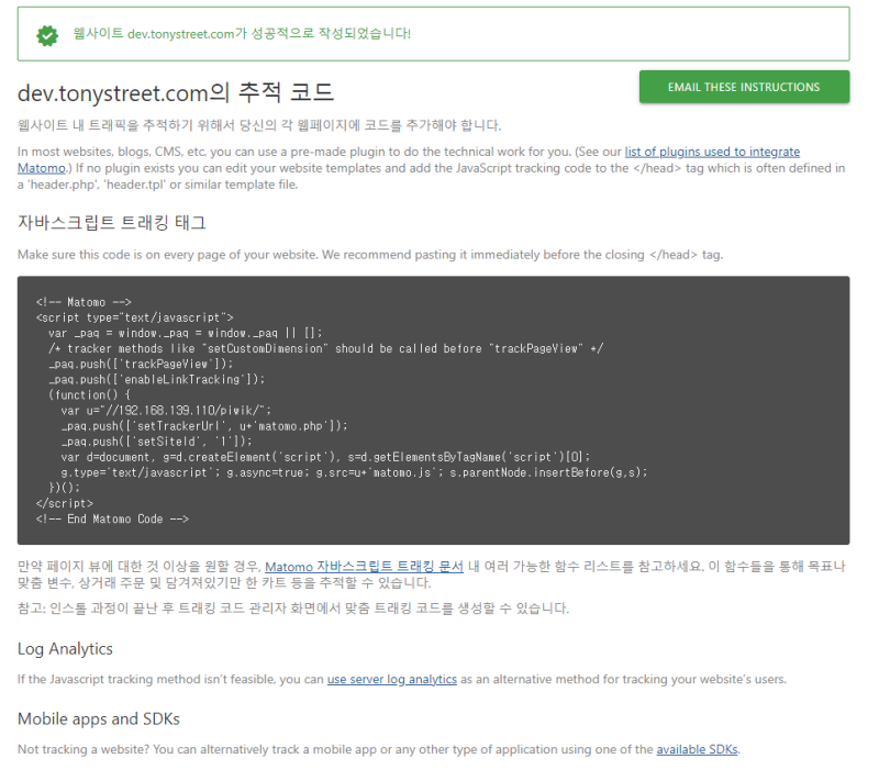 | [참고][AWS] Matomo 추적 스크립트 설정: 웹사이트에 적용 및 테스트하기 (5편) (12) | 2024.10.29 |
