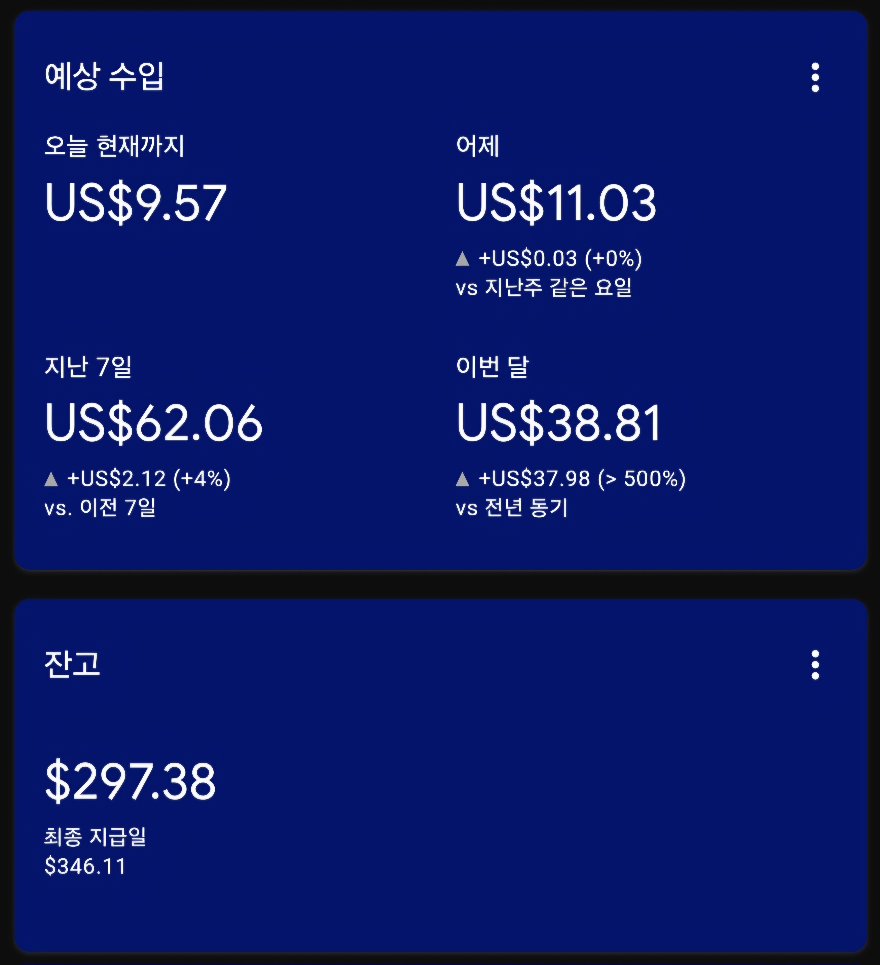 | [인터넷건물주 - 11월 월세] US $61 돌파 - AdSense & Dable 확장 11/6일!! (13) | 2024.11.07 |