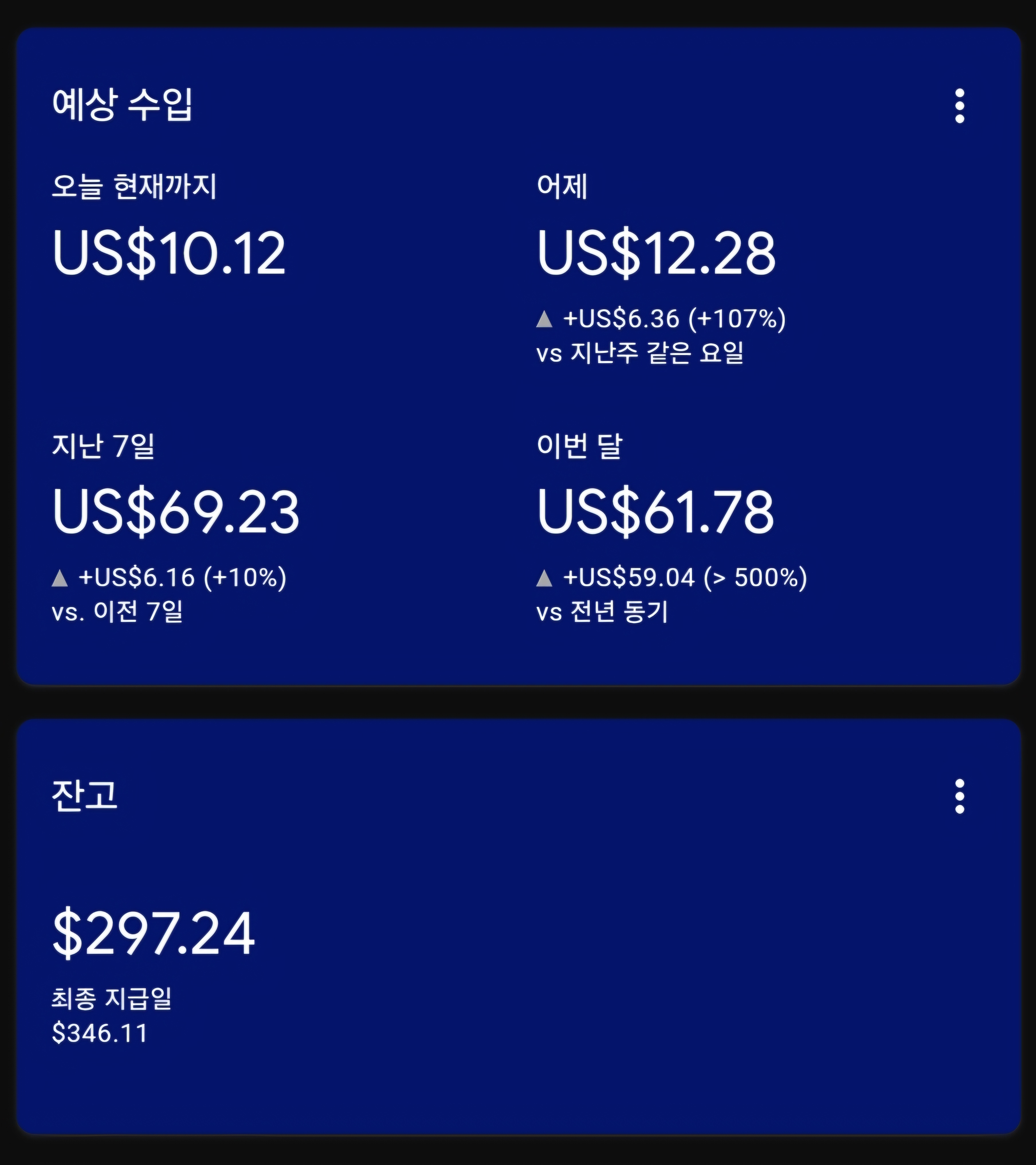 | [인터넷건물주 - 11월 월세] US $83 돌파 - AdSense & Dable 확장 11/8일!! (12) | 2024.11.09 |