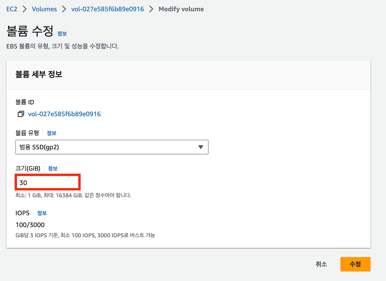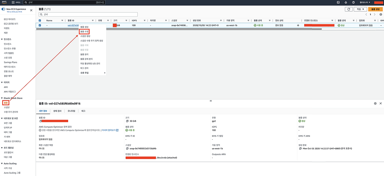 1. AWS EC2 → 좌측 Elastic Block Store - 볼륨 → 볼륨ID 우클릭 → 볼륨 수정