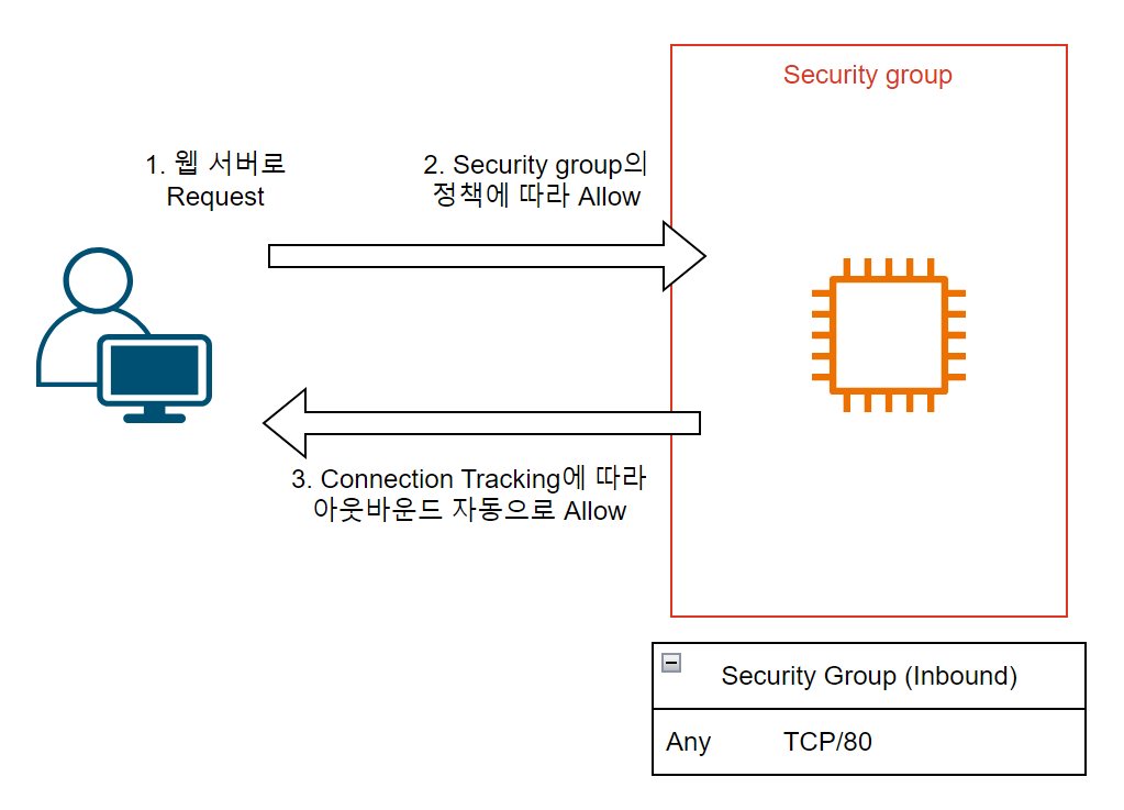 또한, 상태를 저장하기 때문에 한 번 인바운드를 통과한 트래픽은 아웃바운드 규칙에 적용받지 않는다. (Stateful 방화벽의 특징)