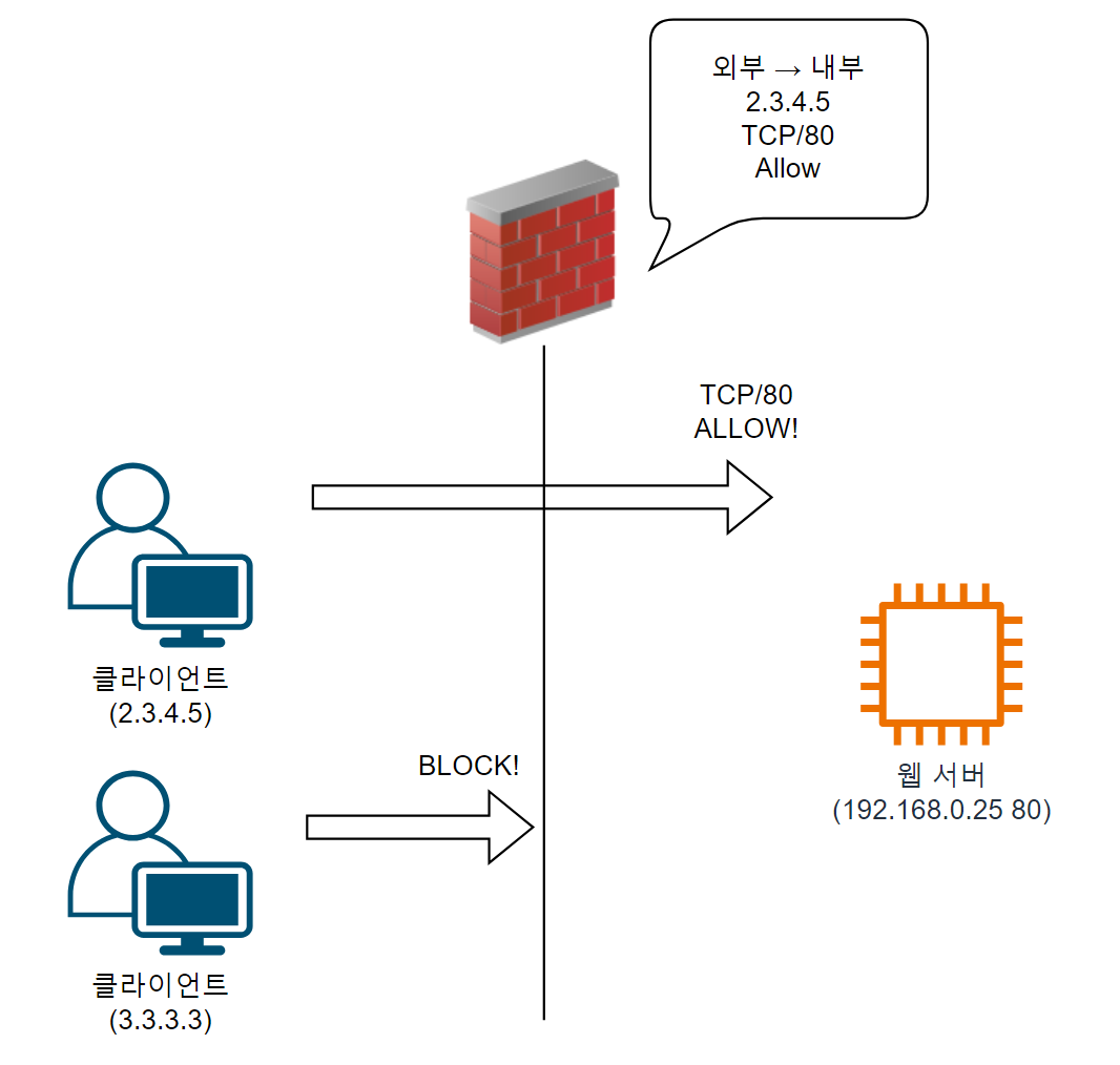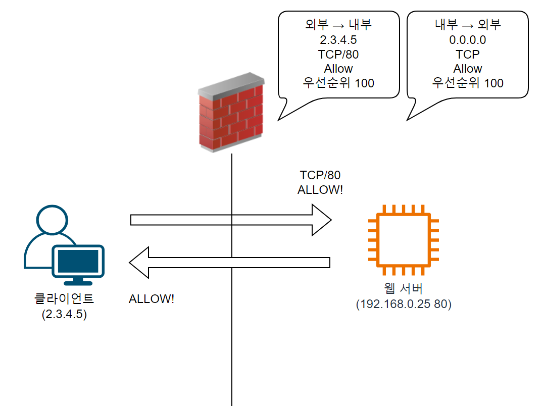 2.3.4.5라는 IP를 가진 클라이언트가 80 포트로 접속을 시도하는 경우, 방화벽에 ALLOW하는 정책이 존재하므로 트래픽이 그대로 내부까지 전달되게 된다.