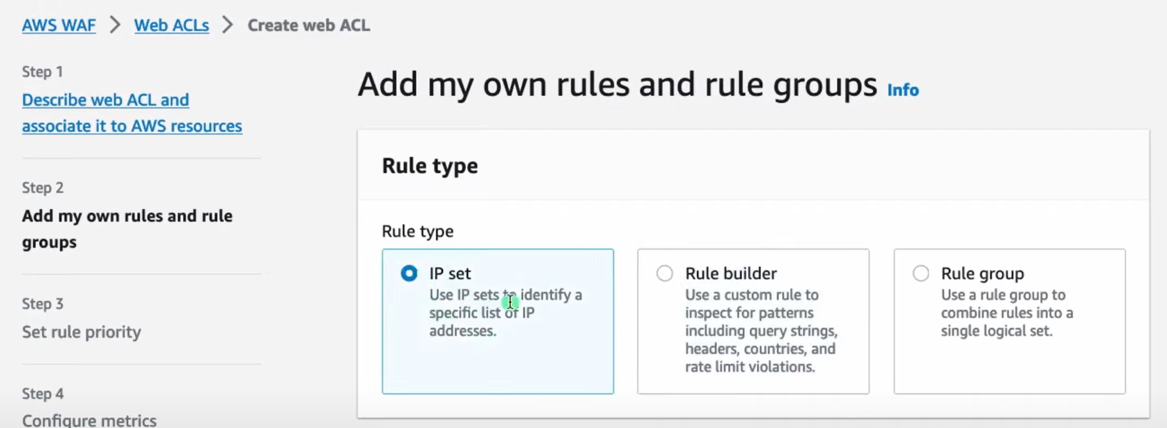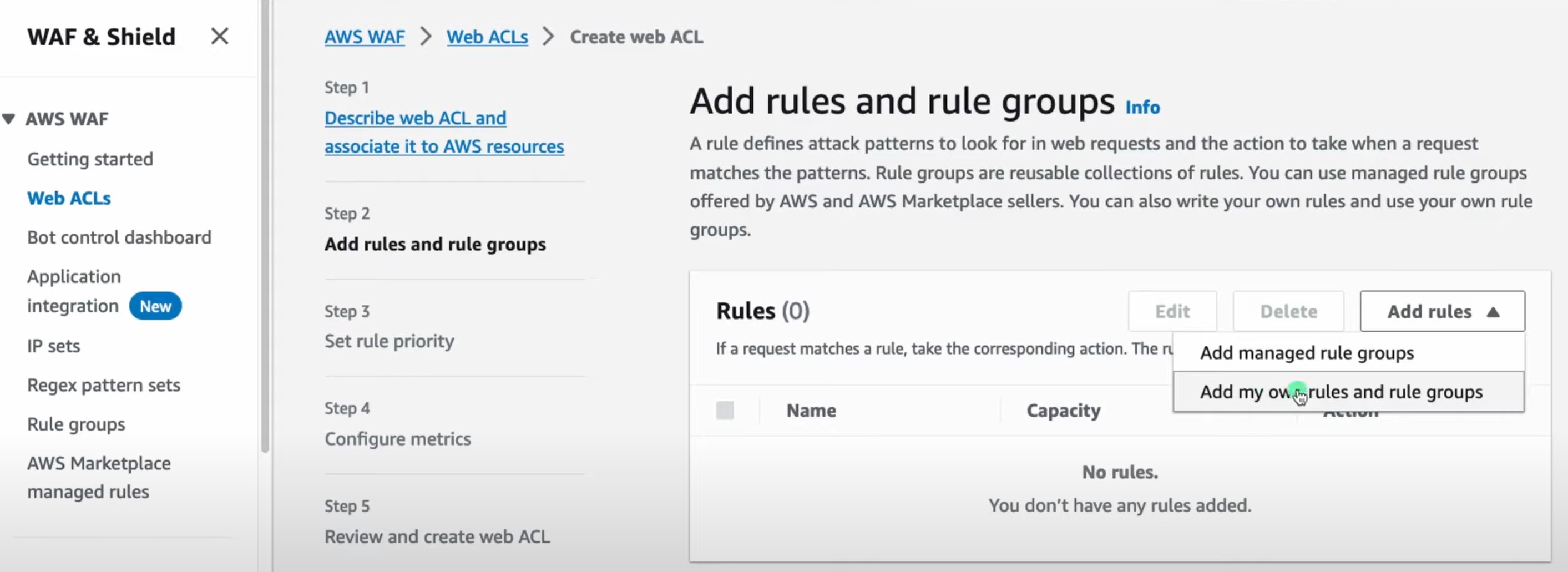 ## Web ACLs 이동 => Add my own rules and rule groups 선택