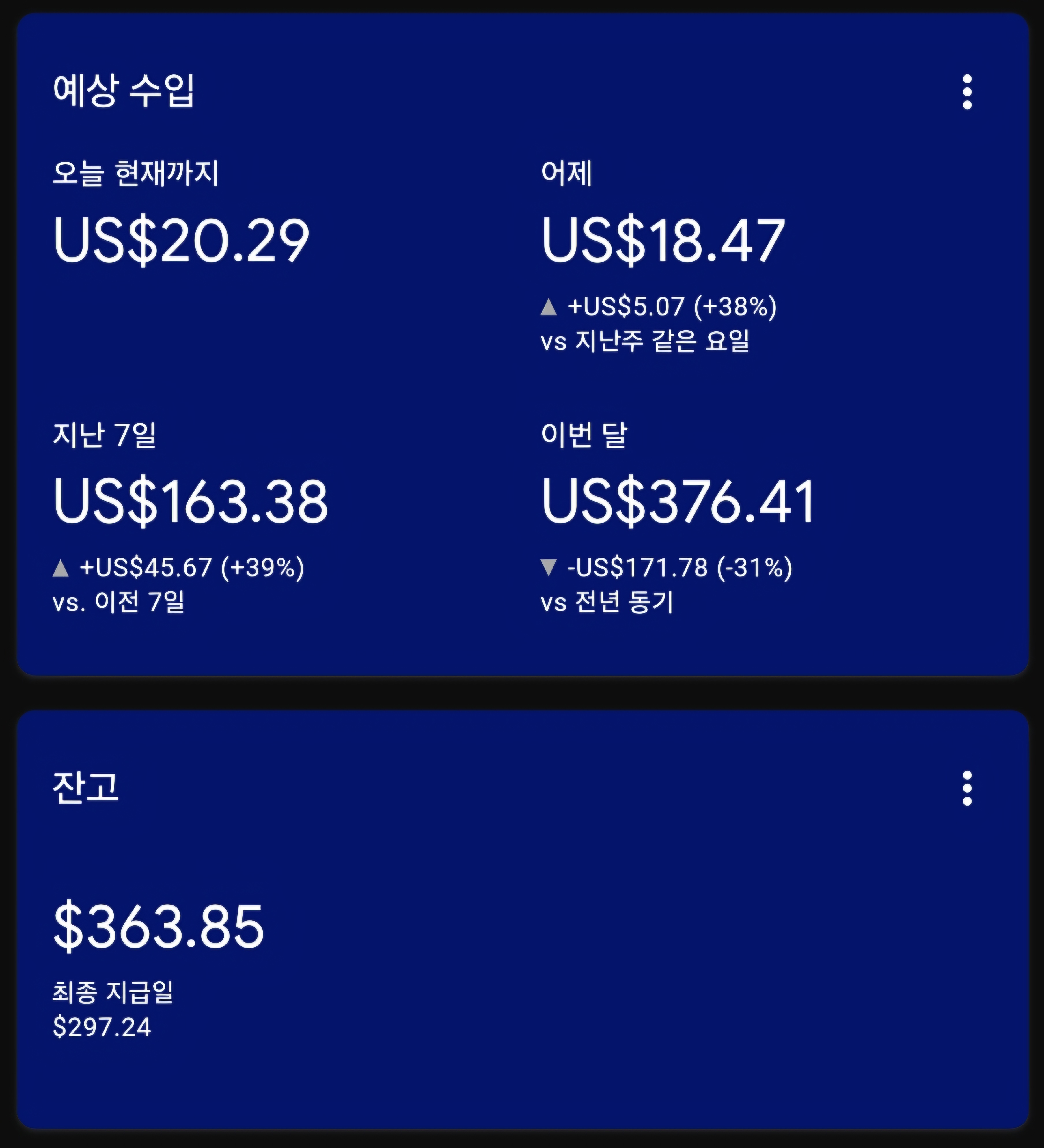 | [인터넷건물주 - 12월 월세] US $394 돌파 - AdSense 12/21일!! (47) | 2024.12.22 |