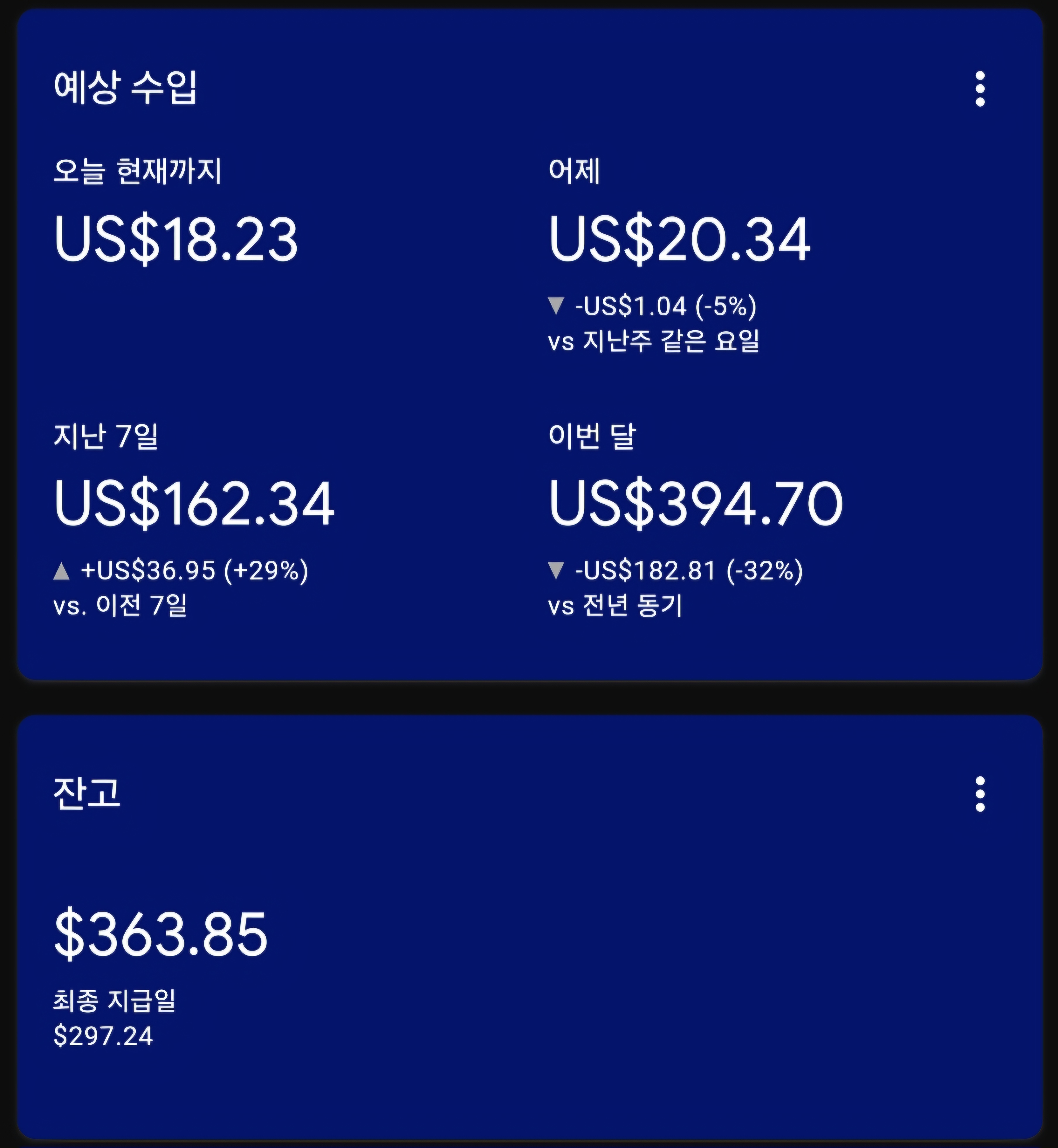 | [인터넷건물주 - 12월 월세] US $376 돌파 - AdSense 12/20일!! (46) | 2024.12.21 |