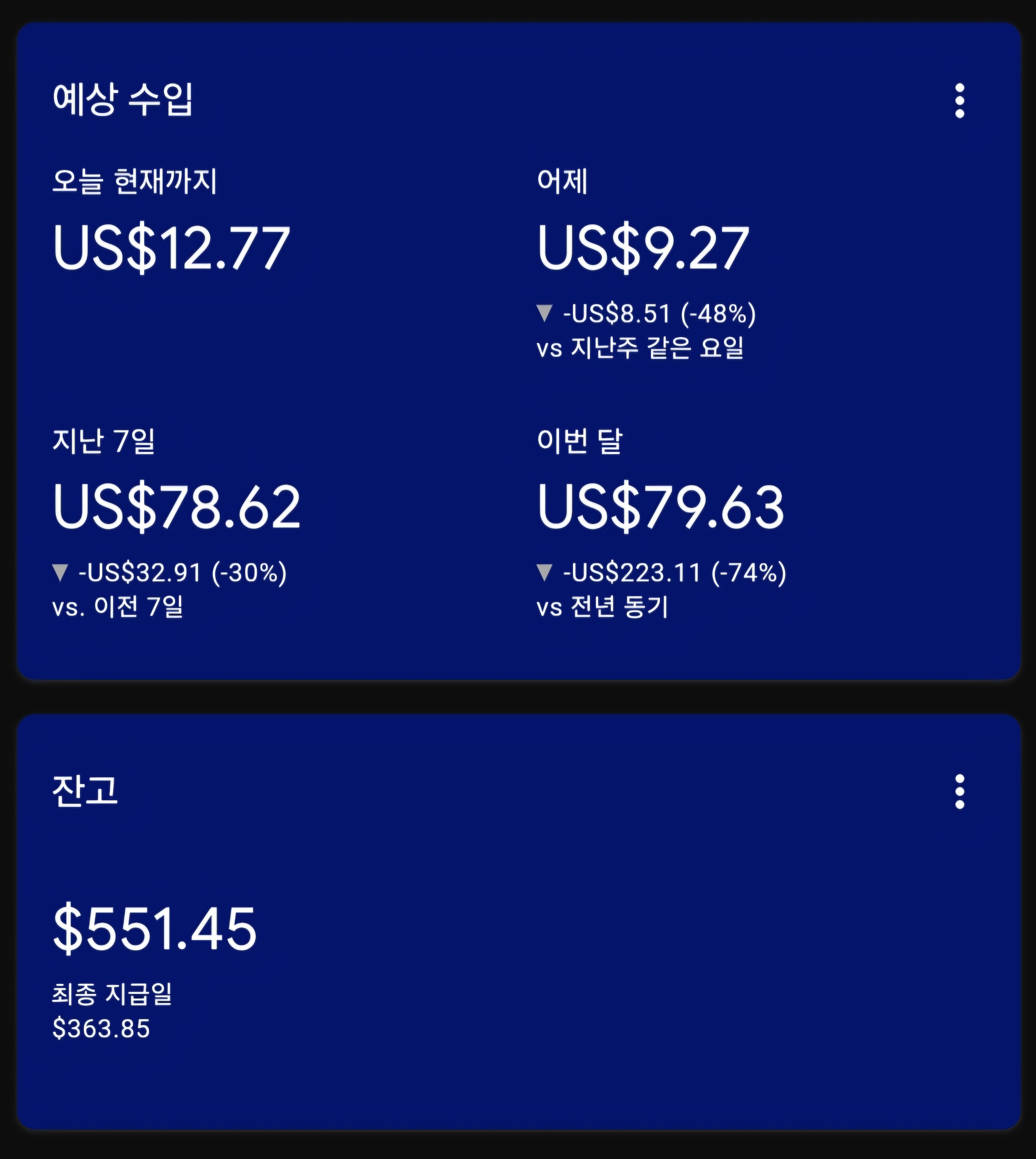 | [애드센스 총수익] 인터넷 건물주 - AdSense US $9,000 돌파!! (12) | 2025.01.10 |