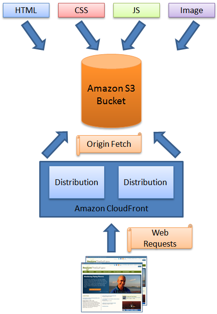 지금까지 CloudFront는 Amazon S3의 콘텐츠를 제공할 수 있었습니다. 콘텐츠 배포 용어에서 S3는 유일하게 지원되는 원본 서버 였습니다. 웹 객체(웹 페이지, 스타일 시트, 이미지, JavaScript 등)를 S3에 저장한 다음 CloudFront 배포를 생성합니다. 다음은 기본 흐름입니다.