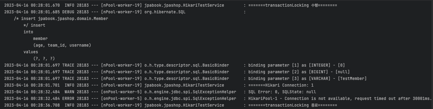 - 30초 후 saveMember() 는 Connection을 획득하지 못했으므로 예외 발생