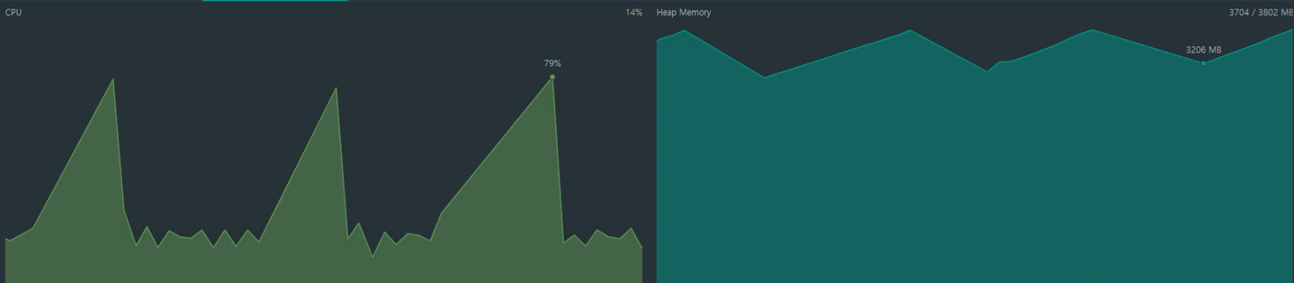 아래는 데이터를 적재하는 동안의 CPU, Heap Memory 그래프입니다.