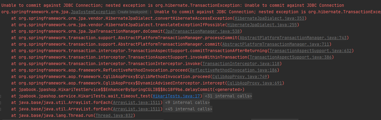 2022-12-22 01:56:21.205 INFO 17092 --- [nio-8080-exec-3] com.zaxxer.hikari.pool.ProxyLeakTask : Previously reported leaked connection conn0: url=jdbc:h2:mem:testdb user=SA on thread http-nio-8080-exec-3 was returned to the pool (unleaked)ㅂ